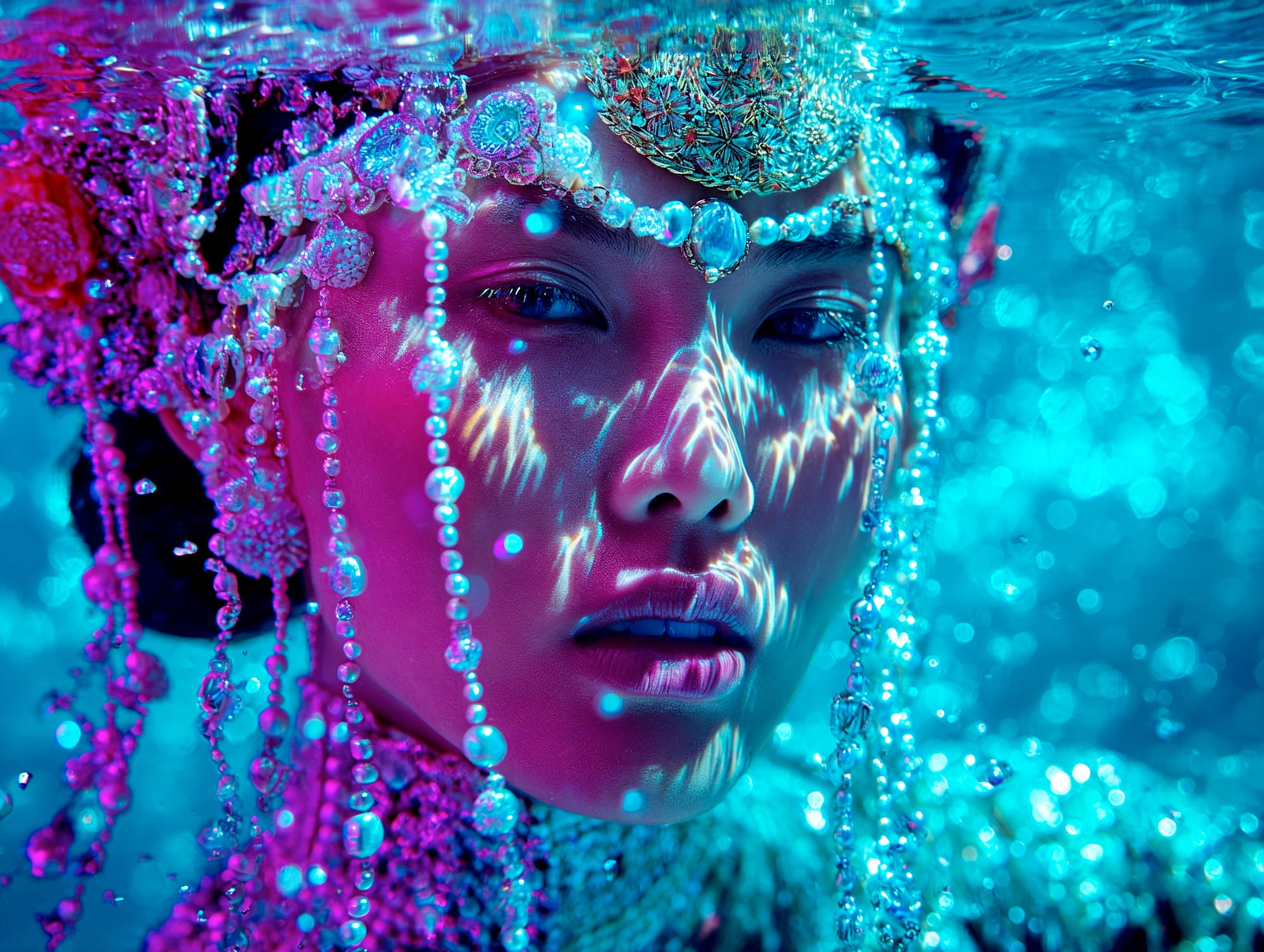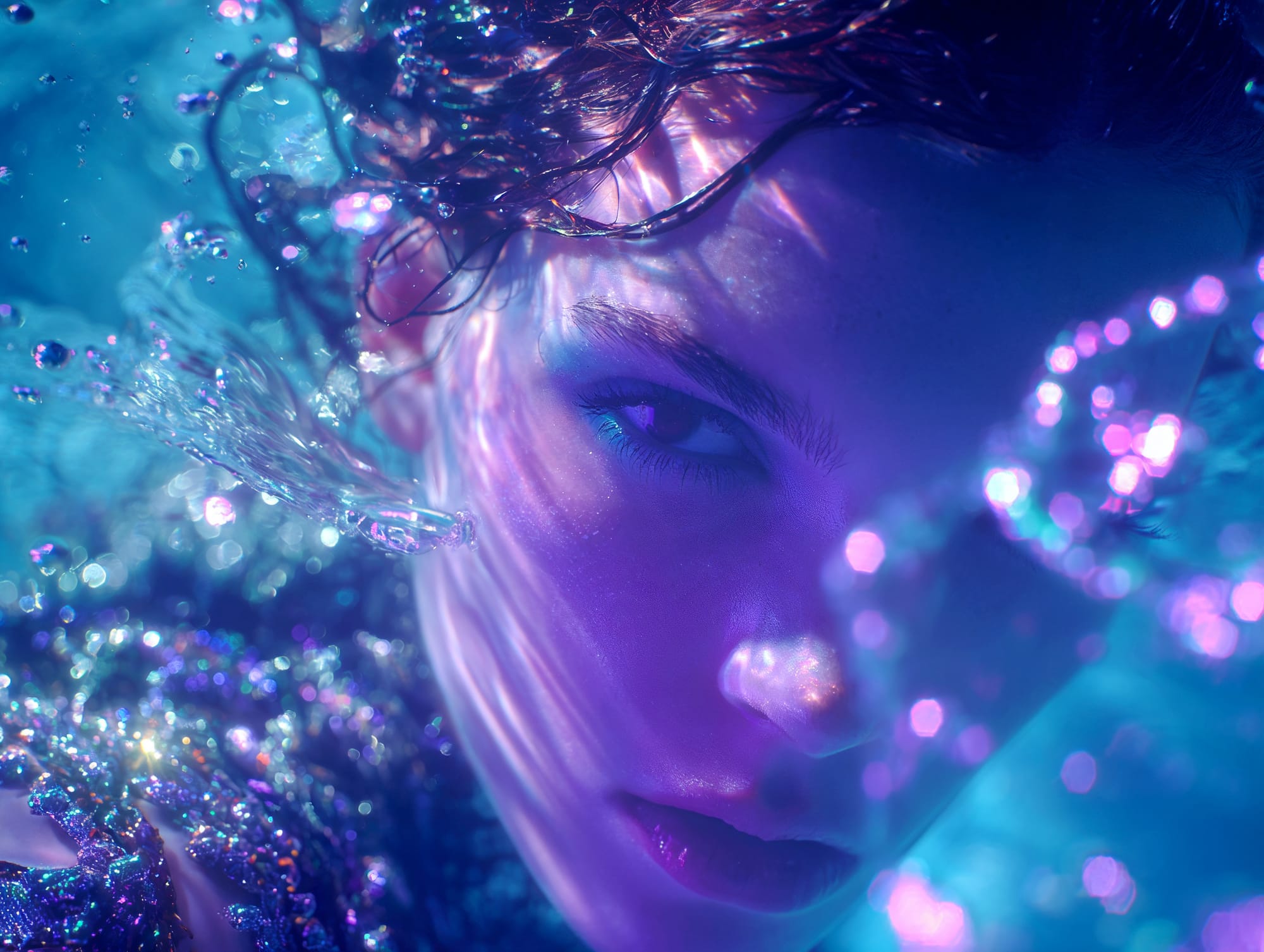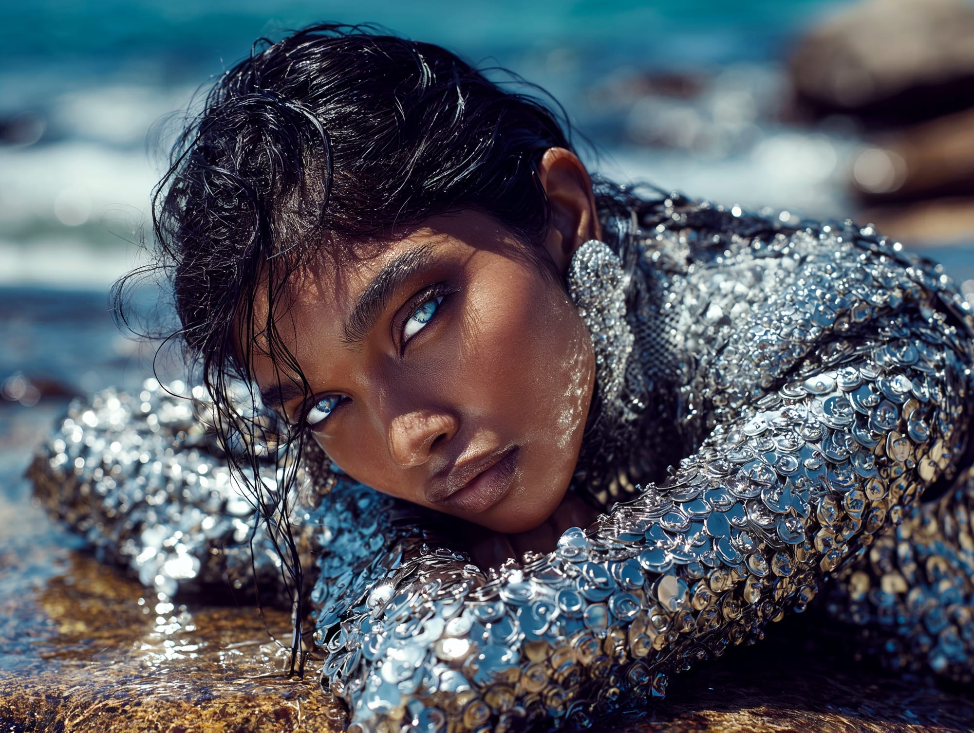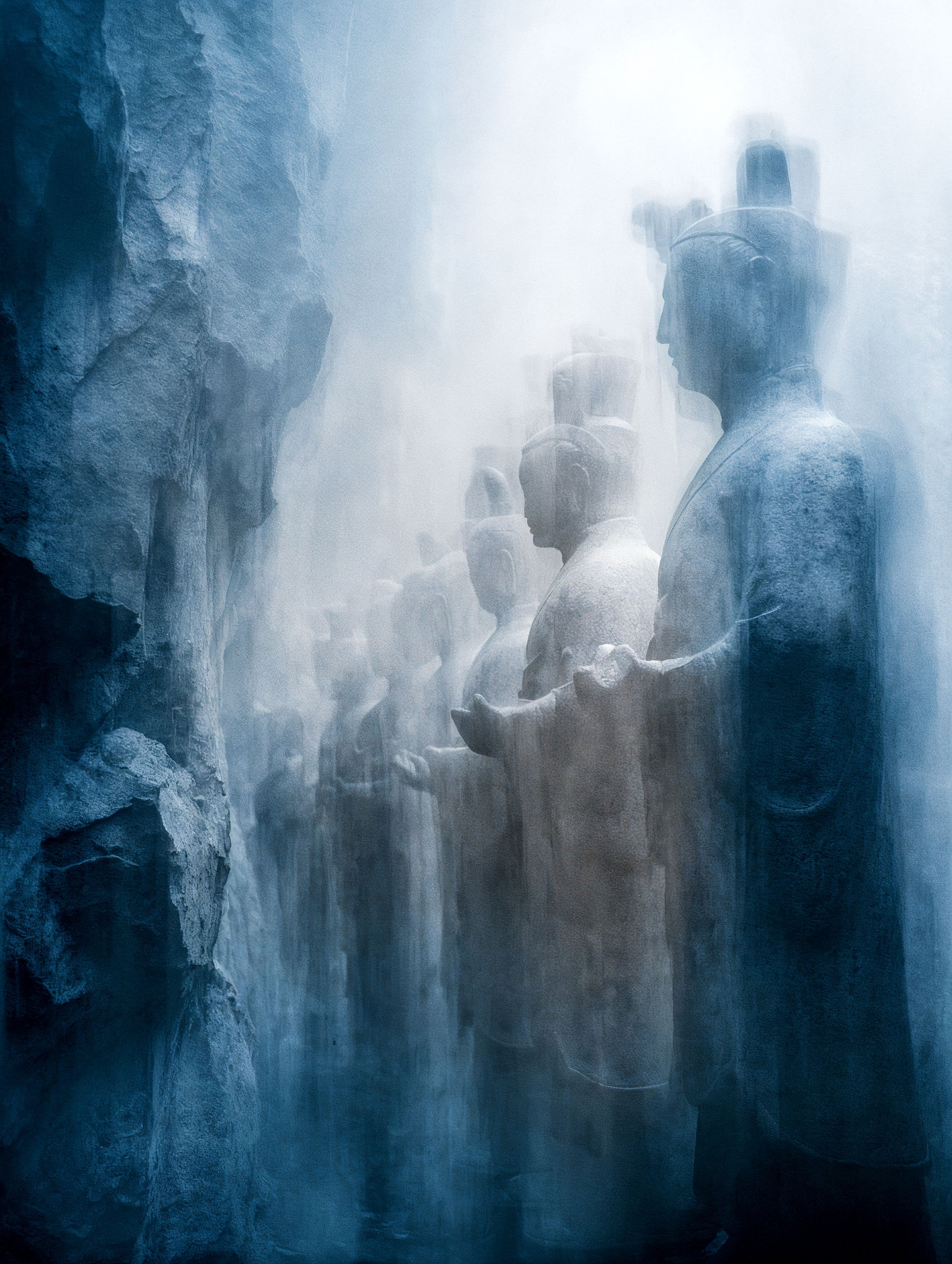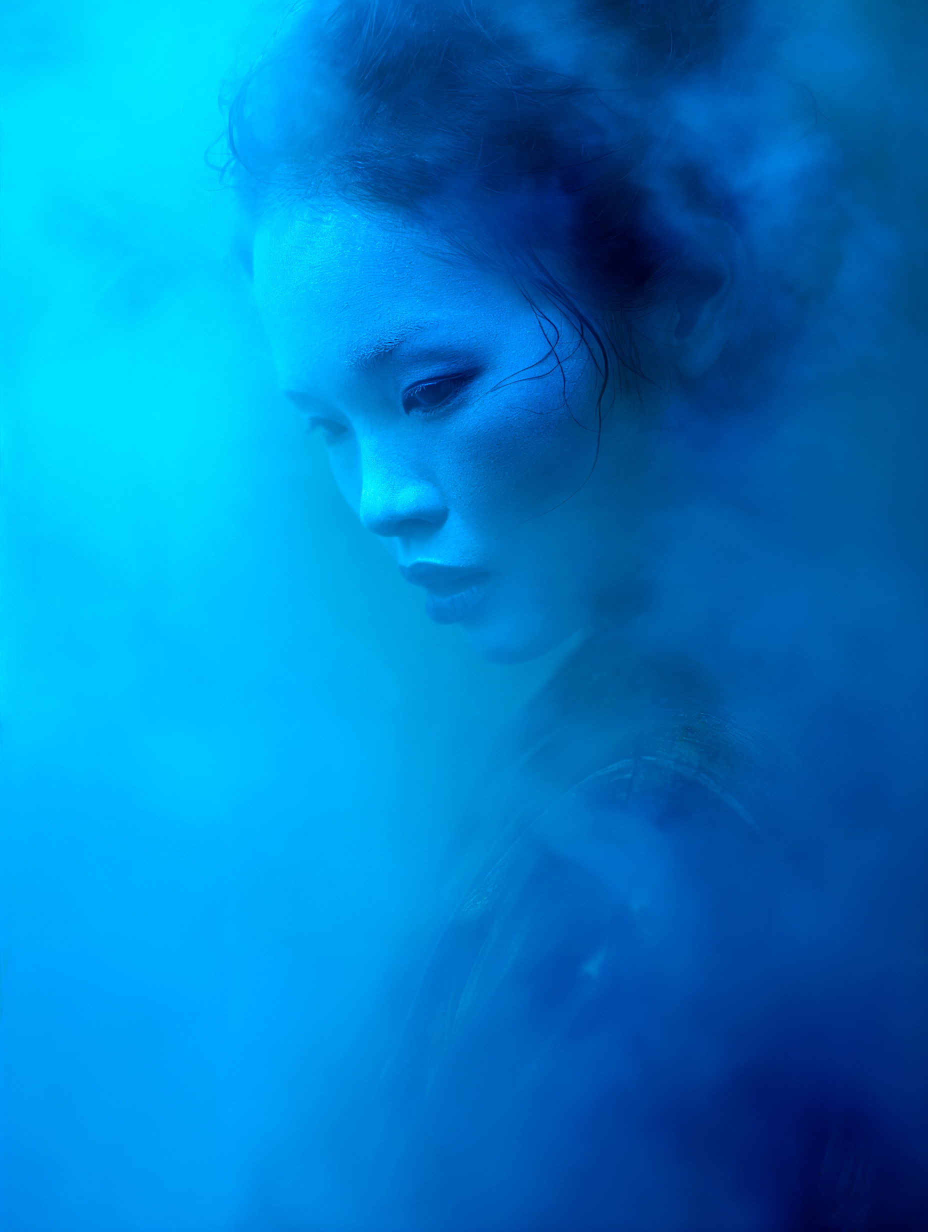 L'eau est l’origine de la vie. La mer a failli m’engloutir, enfant ! Emporté au loin par la houle, le vent et les vagues de la mer Egée, aveuglé par les larmes, désespéré, et alors que je m’épuisais à revenir vers la côte, trois jeunes femmes sont sorties des flots comme par enchantement pour me ramener sur la plage. J’ai depuis, en mémoire, ces sirènes me consolant, et, glissant dans l’eau brillante avec moi, transformant cette aventure terrifiante en pure féerie. On dit que si vous êtes sincère et que votre cœur est pur, elles demeurent avec vous pour toujours. Je revis constamment ce souvenir à la fois menaçant et d'une beauté irréelle et rêve de retrouver mes fées. Depuis, je parcours les mers pour les retrouver, revoir leurs visages, fasciné par l’harmonie de leurs corps caressant l’océan. Chaque photographie est une prière silencieuse, une tentative de capturer à nouveau la magie de cette rencontre. Alors je glisse encore, inlassablement, au coeur des vagues, dans le scintillement des crêtes, le miroitement de l’eau, à la recherche de la lumière, de la couleur exacte de l’eau ce jour là, de cet instant magique, dans l’Eternité. Je plonge dans la splendeur de l’onde en quête de preuve tangible de ce que j ai vécu, de la confirmation que ce souvenir d'enfant était plus qu’un songe. Je sais que pour les recontrer je dois devenir l’eau, me fondre dans le bleu de l'Azur. J’immortalise leur royaume pour les rappeler, peut-être aussi les rejoindre et ne surtout ne jamais les oublier.